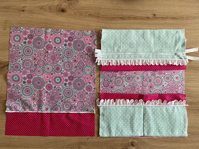 Otra variante es juntar el bolsillo grande con el bolsillo pequeño con una costura de separación. Así se consiguen más apartados y se puedes organizar mejor las cosas.