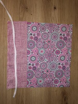 Ahora preparas la cadena del chupete. Para hacer esto, simplemente cose una tira estrecha de tela colocando el trozo de tela para la cadena de la tetina en el medio con los lados derechos juntos y cosiéndolos juntos. Girar una tira de tela tan estrecha requiere un poco de práctica. A menudo uso un imperdible para esto. Cuando hayas dado la vuelta a la tira, plánchala de manera que la costura quede en el medio. Ahora mete el margen de costura en la tira de un lado de la tira de tela vuelta, plánchala suavemente y pespuntea la abertura con un borde estrecho.